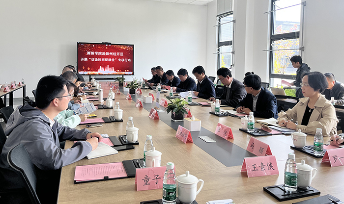 4月11日,校党委书记毕明福带队赴滁州经开区开展访企拓岗促就业专项行动,相关职能部门和二级学院负责人陪同调研。滁州经开区党工委委员、管委会副主任金娟与经开区15家企业代表参加座谈,并出席校企合作协议签约仪式。