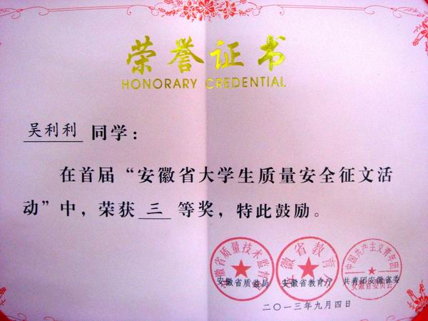 近日,安徽省质量监督局、安徽省教育厅等多家单位主办提高质量安全监督主题征文活动揭晓,bat365在线平台登录体育学院2011级体教1班吴利利获“三等奖”。