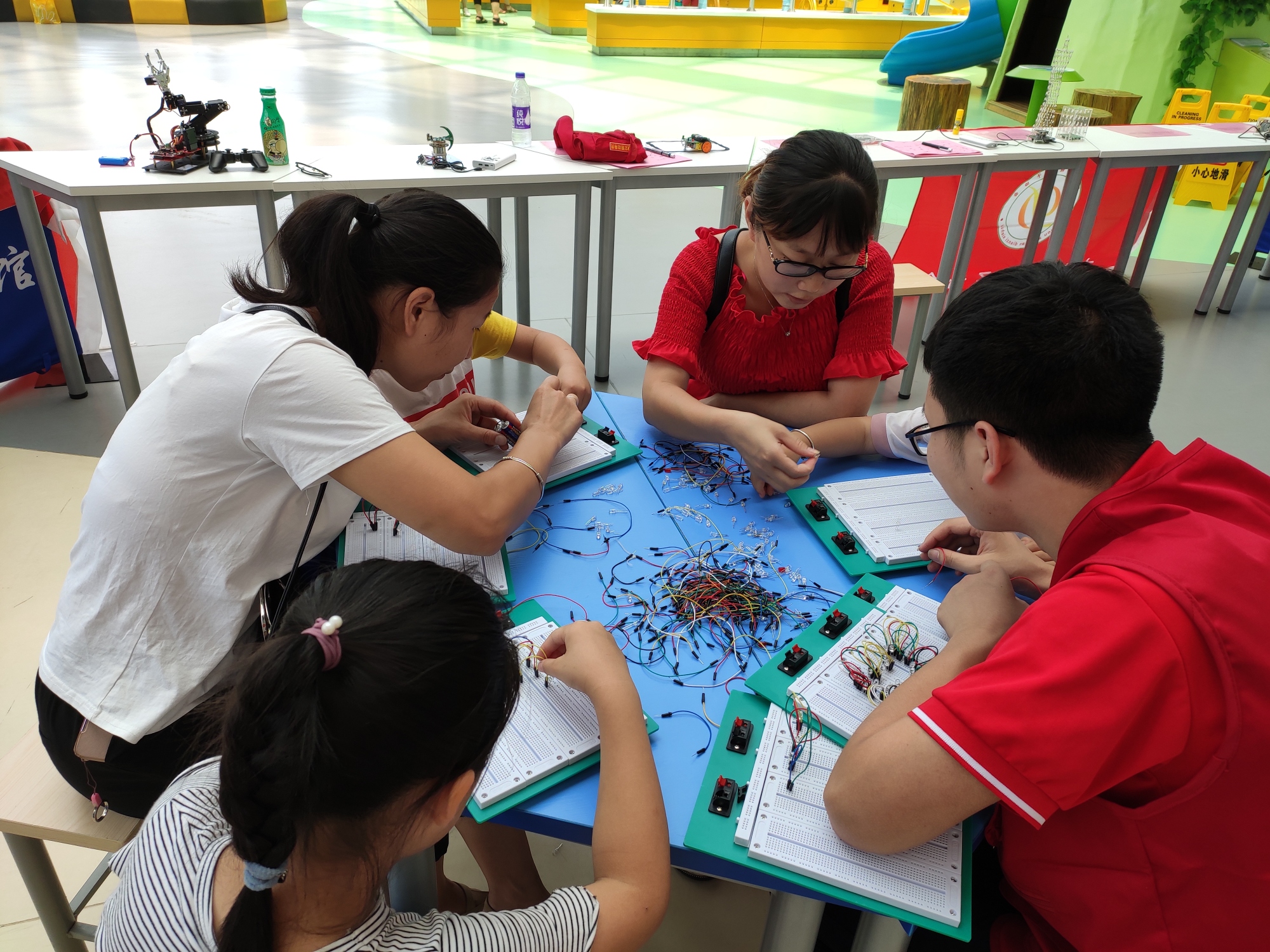 一些对活动感兴趣的家长带着孩子一起参加"DIY彩灯电路"实验。志愿者在一旁耐心细致的指导。 中国青年网通讯员 崔晴雨 摄