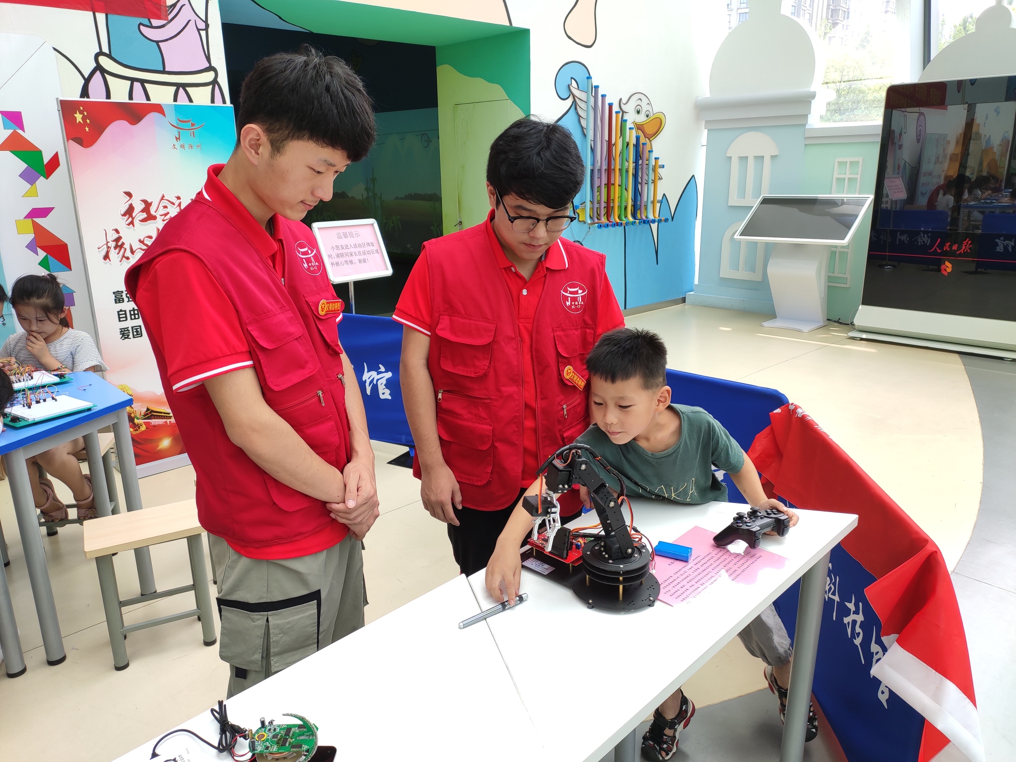 小朋友在经过志愿者的细心指导后,自己实际动手使用操作手柄操作机器人手臂夹取笔。中国青年网通讯员 崔晴雨摄